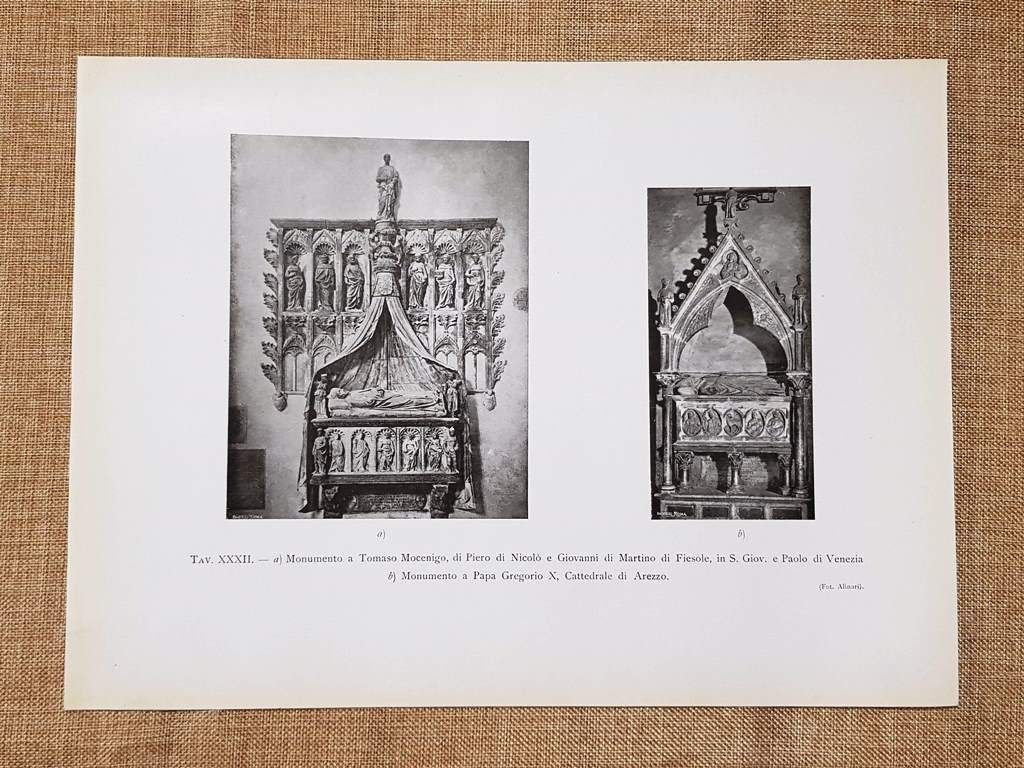 Monumento a Tommaso Mocenigo Venezia e Monumento a Papa Gregorio X Arezzo 1917 Rara tavola estratta da pubblicazione del 1917 Stampata su carta non retroscritta Monumento a Tommaso Mocenigo Piero di Nicolò e Giovanni di Martino di Fiesole Chiesa di San Giovanni e Paolo Venezia e Monumento a Papa Gregorio X Cattedrale di Arezzo Dimensioni: Cm 22,00 x 30,00 Codice prodotto: 1911-074