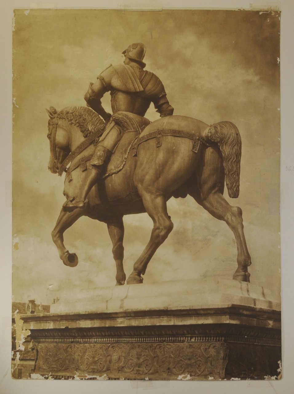 Riproduzione fotografica originale all'albumina di mm 565 x 410. Ripresa laterale del Monumento equestre a Bartolomeo Colleoni, situato in campo SS. Giovanni e Paolo a Venezia. Buono stato di conservazione, senza perdita di tono, contrasti notevolissimi. Notevole prodotto artistico della casa fotografica Alinari; esemplare di grande fascino chiaroscuralei. La Fratelli Alinari, costituita a Firenze nel 1852 da Leopoldo Alinari (1832-1865) e dai fratelli Giuseppe (1836-1890) e Romualdo (1830-1890) è l’azienda di più antica fondazione al mondo operante nel campo della fotografia e più in generale nel settore delle immagini e della comunicazione.