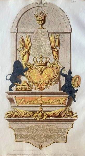 Stampa antica ed originale del monumento, con bellissimi colori miniati coevi, in onore al Principe Eugenio di Savoja nella chiesa di S. Stefano di Vienna cd2606