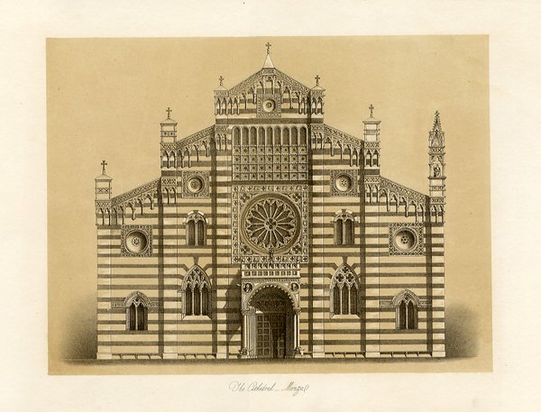 MONZA - The Cathedral. Bella litografia della facciata molto particolareggiata.