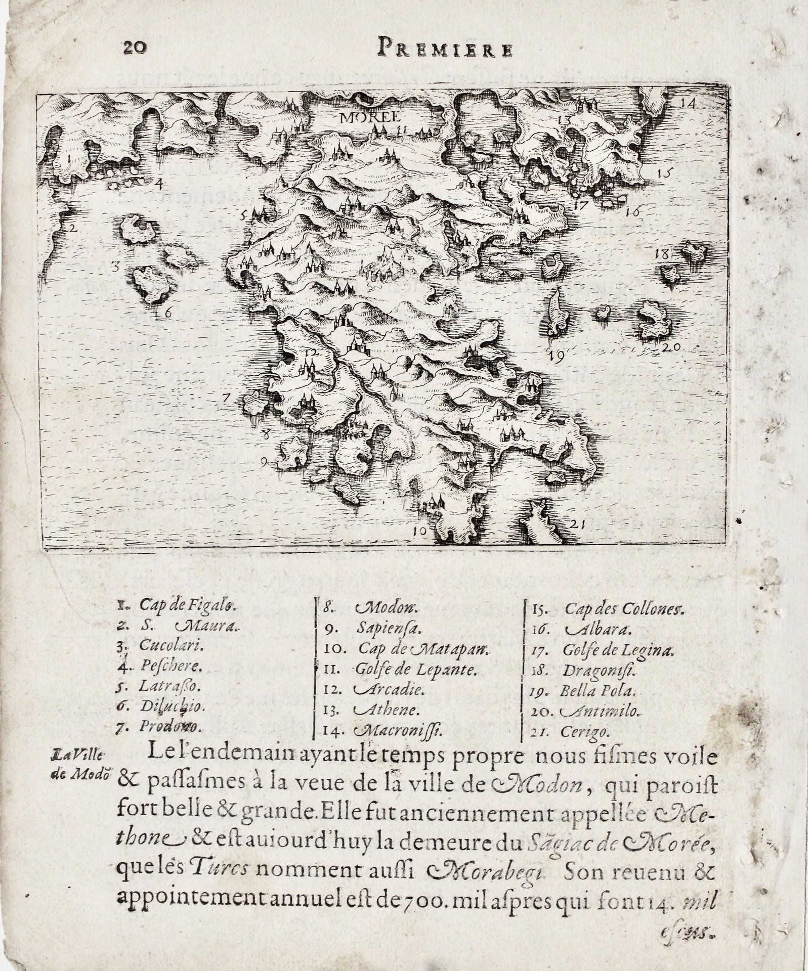 Incisione in rame su foglio mm 230x180, lastra mm 105x155, di Jean Appier Hanzelet tratta da "Relation journaliere du voyage du levant faict & descrit…". L'incisione inserita nel testo francese riguarda la Morea con legenda di 21 punti in basso.<BR>Beauvau nel 1605 fece una spedizione attraverso Grecia, Turchia, Cipro, Palestina ed Egitto, uno dei diari di viaggio francesi più ampiamente illustrati della prima metà del XVII secolo relativi al Vicino Oriente. Di particolare rilievo è l'uso di Beauvau dell'illustrazione cartografica suggestiva degli isolari italiani del periodo: le 49 mappe e vedute delle isole dell'Egeo, sono incise alla maniera di Cantelli e Camocio. Henri de Beauvau, soldato e diplomatico, combatté i turchi in Ungheria prima al servizio dell'imperatore Rodolfo III, e poi sotto l'elettore di Baviera. Intraprese questo viaggio nel 1605, considerandolo un'impresa diplomatica piuttosto che un pellegrinaggio. Discreto esemplare che presenta fori di cucitura originale al margine destro, lievi tracce d'umidità marginali.<BR>Copper engraving on a sheet mm 230x180, plate mm105x155, by Jean Appier Hanzelet, taken from "Relation journaliere du voyage du levant faict & descrit…" <BR>Beauvau's 1605 expedition through Greece, Turkey, Cyprus, Palestine and Egypt, is one of the most substantially illustrated French travelogues of the first half of the 17th century relating to the Near East. Of special note is Beauvau's use of cartographic illustration suggestive of the Italian isolarios of the period: the 49 maps and views of Aegean islands, etc., engraved in the manner of Cantelli and Camocio. <BR>Henri de Beauvau, a soldier and diplomat, fought the Turks in Hungary first in the service of Emperor Rudolph III, and then under the elector of Bavaria. He embarked upon this journey in 1605, regarding it as a diplomatic venture rather than a pilgrimage.<BR>Original stitching holes on the inner margin, slight traces of marginal oxidation.<BR>
