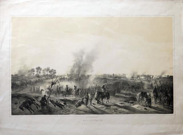 Da “Erinnerungen an die Feldzuge. der K. K. Oester. Armee in italien in den Janren 1848 – 1849” (Adam in Munchen, 1851). Litografia in b/n, cm 47 x 63 (il foglio). Animata scena di battaglia con le truppe austriache in aperta campagna durante la prima guerra d’Indipendenza. Alcune pieghe e imperfezioni marginali, buona impressione, buono stato di conservazione. .