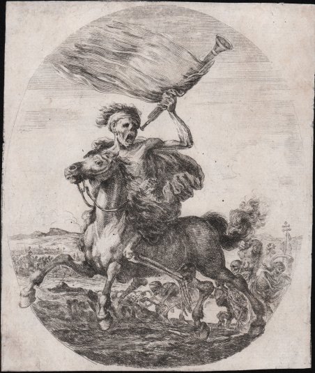 Morte a cavallo, con tromba; in una composizione ovale, la figura scheletrica della Morte a cavallo verso sinistra, con una tromba e uno stendardo nella mano sinistra; sullo sfondo un campo di battaglia e a destra altri morti. Acquaforte e bulino, 1648 circa. Esemplare nel secondo stato di tre, prima dell'indirizzo di Vincent. Magnifica prova, stampata su carta vergata coeva, tagliata all'interno dell'impronta del rame e completa della parte incisa, in ottimo stato di conservazione. Della serie “Le cinque Morti – Les Cinq Morts”, che l’autore completa in Francia. Fu probabilmente durante i suoi ultimi anni in Francia che Della Bella iniziò una versione aggiornata della Danza della Morte. Questo soggetto tipicamente nordico e medievale di solito mostrava la Morte in una varietà di situazioni, portando via vittime di ogni età ed estrazione sociale. Mentre era in Francia Della Bella incise quattro scene ovali della conquista della Morte, compresa questa stampa (La Morte che porta un bambino), tre delle quali si svolgono nei cimiteri e la quarta sul campo di battaglia. Una versione orizzontale della Morte che trionfa in guerra risale probabilmente a questi anni. Alla fine della sua vita, Della Bella riprese il tema, creando altri tre episodi nel formato ovale, due dei quali rimasero incompleti alla sua morte. Soprattutto nelle prime stampe, la Morte è tanto energica quanto spietata: qui la Morte porta sulle spalle una donna con la testa rivolta verso il basso, seguita a distanza da un'altra Morte che tiene in braccio un cadavere. L'ambientazione è il Cimitero degli Innocenti a Parigi, un luogo che della Bella conosceva senza dubbio, dato che molti editori e commercianti di stampe avevano i loro negozi al piano terra degli ossari. Stefano della Bella fu uno degli incisori più interessanti e originali nella Firenze del XVII secolo e può considerarsi l’unico geniale continuatore dell’opera di Jacques Callot. La sua educazione artistica ebbe inizio a Firenze nella bottega degli orafi Gasparo Mola e Orazio Vanni, e la precisione del segno, tipica dell’arte orafa resterà caratteristica del suo stile. Studiò poi presso Giovanni Battista Vanni e forse anche presso il Cantagallina e Cesare Dandini, ma ben presto si dedicò all'incisione. Il suo vero maestro può considerarsi Jacques Callot, l’incisore francese che soggiornò a lungo a Firenze lasciando una forte impronta nel panorama artistico della città. Gli anni più importanti della sua carriera sono quelli che trascorre a Parigi, dal 1639 al 1650, stipendiato da Lorenzo de' Medici: lavorò insieme ad Israel Silvestre, con gli editori Langlois, Ciartres e Pierre Mariette, per stampatori francesi e per commissioni di gran prestigio, come quelle del 1641 per il cardinale Richelieu che gli affidò le illustrazioni delle sue imprese guerresche. Intorno al 1647, durante un viaggio in Olanda, dove eseguì le acqueforti con le vedute del porto di Amsterdam, incontrò Rembrandt e da quella data notiamo una eco profonda dell’arte dell’olandese nella grafica del Della Bella. ' Bibliografia De Vesme - Massar Stefano della Bella (1971) n. 89, II/III; F.Carey (ed.), "The Apocalypse and the Shape of Things to Come", exh. cat., BM, London, 1999, nos 112-115. Death on horseback, with a trumpet; in an oval composition, the skeletal figure of Death riding on a horse towards left, holding a trumpet with a banner aloft in his left hand; in background a battlefield and to right further Deaths. Etching with engraving, 1648 circa. Example in the second state of three, before the Vincent’s address. Magnificent proof, printed on contemporary laid paper, cut inside the copper imprint and complete with the engraved part, in excellent condition. From the series ' The Five Deaths- Les Cinq Morts, which Della Bella completed in France. It was probably during his last years in France that Della Bella began an updated version of the Dance of Death. This typically Northern and medieval subject usually showed Death in a variety of situations, carrying away victims of every age and walk of life. While in France Della Bella etched four oval scenes of Death's conquest, including this print (Death Carrying a Child), three of which take place in cemeteries and the fourth on the battlefield. A horizontal version of Death triumphing in war probably also dates to these years. At the end of his life, Della Bella took up the theme again, creating three more episodes in the oval format—two of these were left incomplete at his death. In the early prints particularly, Death is as energetic as he is ruthless—here Death ' carrying off a ' female ' on his shoulders, with her head downwards, followed at a distance by another ' Death ' holding a corpse in his arms. The setting is the Cemetery of the Innocents in Paris, a site with which della Bella was undoubtedly familiar, since many publishers and print dealers had their shops on the ground floor of the charnel houses. Stefano della Bella was one of the most interesting and original engravers in 17th-century Florence and can be considered the only brilliant continuator of Jacques Callot's work. His artistic education began in Florence in the workshop of the goldsmiths Gasparo Mola and Orazio Vanni, and the precision of sign, typical of the goldsmith's art, will remain characteristic of his style. He then studied under Giovanni Battista Vanni and perhaps also under Cantagallina and Cesare Dandini, but soon turned to engraving. His real master can be considered Jacques Callot, the French engraver who stayed in Florence for a long time and left a strong imprint on the city's artistic scene. The most important years of his career were the ones he spent in Paris, from 1639 to 1650, salaried by Lorenzo de' Medici: he worked together with Israel Silvestre, with the publishers Langlois, Ciartres and Pierre Mariette, for French printers and for commissions of great prestige, such as those of 1641 for Cardinal Richelieu