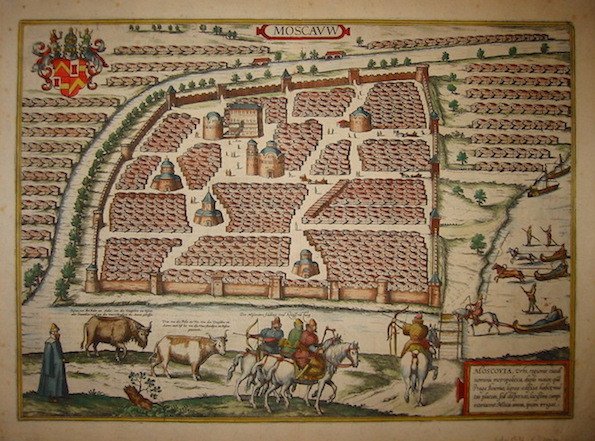 Incisione originale su rame (cm. 49x35,5 più ampi margini) dalla celebre e monumentale opera ‘Civitates Orbis Terrarum’ pubblicata tra il 1572 ed il 1617. Testo in lingua latina la verso. Bella coloritura antica all’acquarello. Carta vergellata con filigrana. Esemplare in ottimo stato di conservazione. Based on Sigismund von Herberstein’s own 1547 map, it shows the city of Moscow from a slightly elevated viewpoint across the frozen Moskva River. The walled centre of the city is depicted with its many churches and rows of houses, and filled with people and horse-drawn sleighs, others of which are shown, along with skiers, on the river to the right. In the top left corner is the nicely adorned coat of arms of the city. In the foreground are depicted four armed Russian soldiers on horseback. The German caption above them indicates they are wearing the typical “Moscovite war armament”. These graphically reflect the growing military power of Moscow under Grand Duke Ivan IV (Ivan the Terrible), who was the first to assume the title of Tsar of Russia and who established the city as the capital of the Grand Duchy of Russia in 1547, not long before this image was made. Next to the soldiers appear two types of cattle, typical for the region. The first one is the European bison and the right one the auroch, an extinct type of large wild cattle that inhabited Europe, Asia and North Africa.