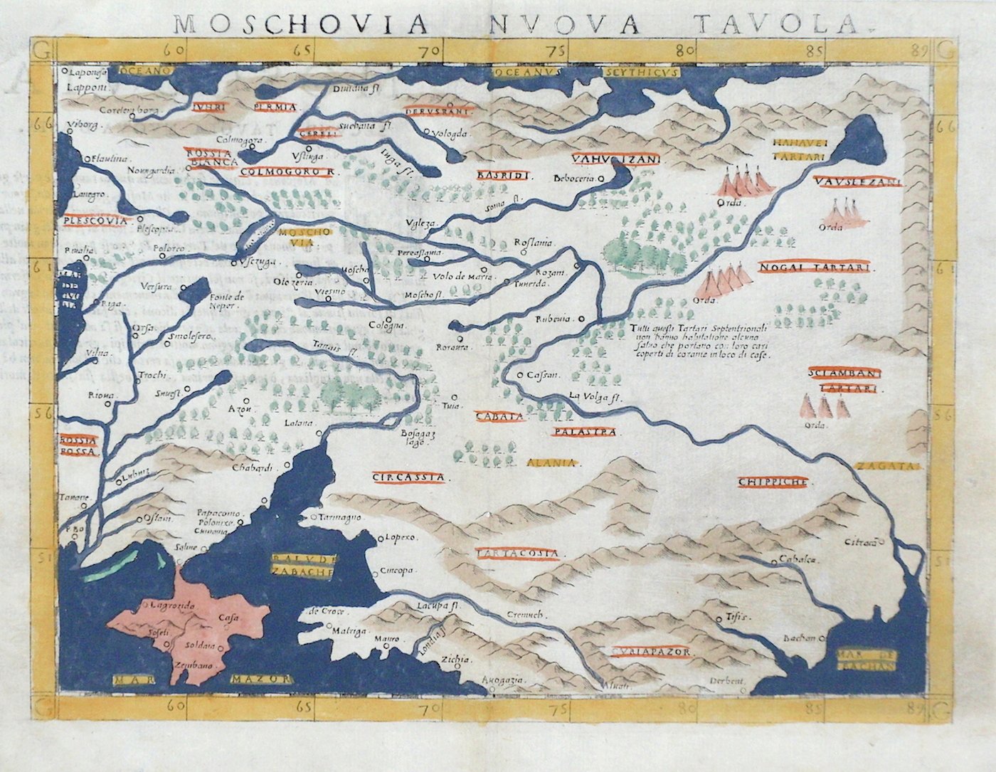 Incisione in rame, colorata a mano, di mm 190x263, tratta dall'edizione veneziana della "Geographia" curata da Ruscelli. Buon esemplare, rifilata alla battuta del rame in alto.