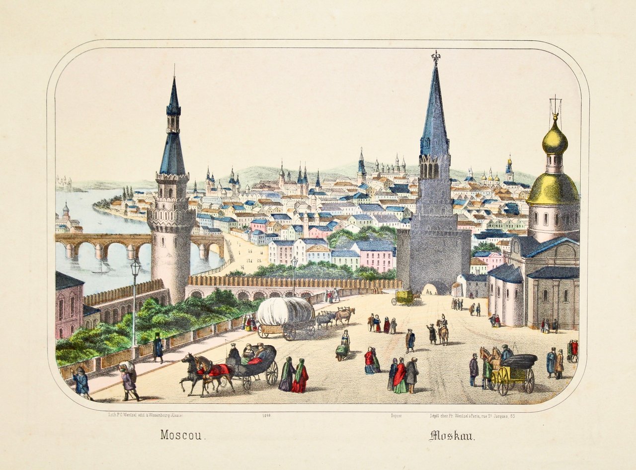 Litografia, dipinta a mano d'epoca, mm 195x290.<BR>Veduta della città colta dal Cremlino. Ottimo esemplare con ampi margini<BR>