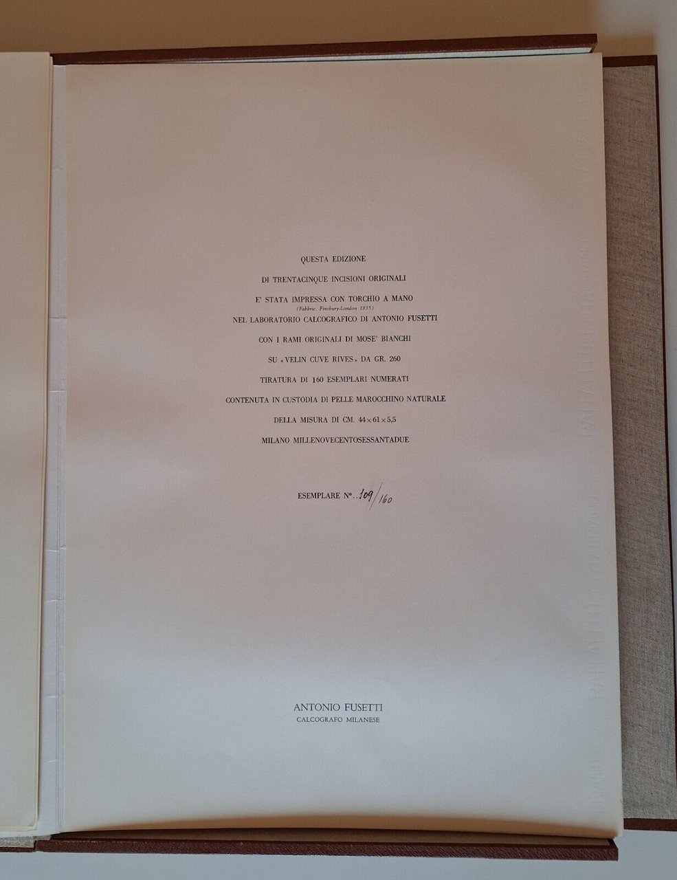 MOSE' BIANCHI L'OPERA GRAIFCA ANTONIO FUSETTI ED. 1962Cm. 60 x 42, legatura editoriale, custodia in similpelle con titolo al piatto, 35 incisioni originali in b/n..Edizione a titratura limitata e numerata in 160 esemplari, questa la n. 109.Prefazioni di ugo Nebbia e Aligi Sassu.Strappo alla custodia al dorso: Interno in ottime condizioni.