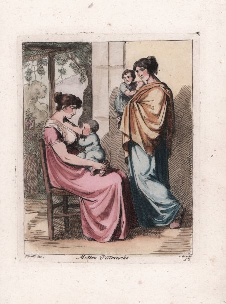 Costume popolare tratto dalla ' Nuova Raccolta di cinquanta motivi pittoreschi e costumi di Roma, 1810. Rara e bella serie, la seconda prodotta dall'artista, raffigurante costumi popolari singoli e in gruppo, scene e mestieri non solo di Roma e dintorni, ma anche di Campania, Calabria e Abruzzi. Stampatore, pittore, scultore e disegnatore italiano. Apprese i rudimenti della scultura dal padre, artigiano di piccole statuette religiose di scarso valore. Questo apprendistato in tenera età incoraggiò Pinelli ad enfatizzare la plasticità e l’espressione rispetto ai valori del Neo-Classicismo, predominanti a Roma. Purtroppo, sono pervenute fino a noi solo pochi esemplari delle sue sculture in terracotta, mentre conosciamo il volume di acqueforti, Gruppi pittoreschi (Roma, 1834), con rappresentazioni di popolani. L’enfasi sul naturalismo e su soggetti di vita quotidiana è di nuovo evidente. Sebbene avesse studiato presso l’Accademia di Belle Arti a Bologna, sostenuto economicamente dal Conte Lambertini, il nipote di Papa Benedetto XIV, Pinelli non aveva interesse a seguire l'iter tradizionale del successo artistico attraverso i soggetti religiosi. Di ritorno a Roma, alla fine del XVIII secolo, decise di vendere le sue opere nei caffè frequentati dai turisti. ' Incisione in rame, finemente colorata a mano, in ottimo stato di conservazione. Popular costume from ' Nuova Raccolta di cinquanta motivi pittoreschi e costumi di Roma, 1810. Rare and beautiful series, the second produced by the artist, depicting individual and group popular costumes, scenes and crafts not only of Rome and its surroundings, but also of Campania, Calabria and Abruzzi. Italian printmaker, painter, sculptor and draughtsman. He learnt the rudiments of sculpture from his father, a maker of cheap religious statuettes. This early training encouraged Pinelli to emphasize plasticity and expression over the Neo-classical values prevalent in Rome. Although only a few of his terracotta figures survive however, he did produce a volume of etchings, Gruppi pittoreschi (Rome, 1834), depicting rustic groups. Its emphasis on naturalism and everyday subject-matter is also characteristic of his sculptures. Although he studied both at the Accademia di San Luca in Rome and at the Accademia di Belle Arti in Bologna, helped financially by Conte Lambertini, Pope Benedict XIV’s nephew, Pinelli was not interested in pursuing the traditional path to artistic success via religious or history painting. On returning to Rome in the late 1790s he chose to peddle his works at the cafés frequented by tourists. Copperplate, finely hand coloured, in excellent condition. Cfr.