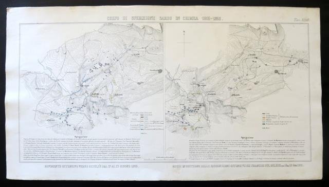 Torino, 1857. Tratta dall’album “Ricordo pittorico militare della spedizione sarda in Oriente negli anni 1855 - 56. Pubblicato d’ordine del Ministro di Guerra per cura del Corpo Reale di Stato Maggiore”. Tavola XXII. Incisione su acciaio, confini in colore d'epoca, cm 42 x 76,5 circa (il foglio). Bella raccolta iconografica e tecnica della guerra di Crimea. Buono stato di conservazione.
