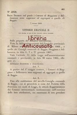 REGIO DECRETO COL QUALE I COMUNI DI MUGGIANO E SELLANUOVA SONO SOPPRESSI ED AGGREGATI A QUELLO DI BAGGIO Vittorio Emanuele II