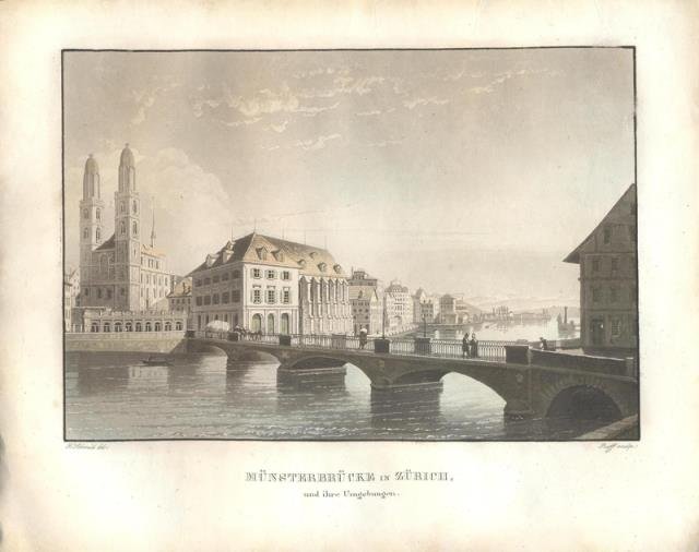 1840 circa. Incisione in rame all'acquatinta, colore d'epoca, cm 19,5 x 24,5 (il foglio). Münsterbrücke è un ponte pedonale e stradale sulla Limmat nella città di Zurigo, in Svizzera. È iscritto nell'inventario svizzero dei beni culturali di importanza nazionale e prende il nome da due Münster, il Fraumünster e il Grossmünster. In bella coloritura e in buona conservazione.