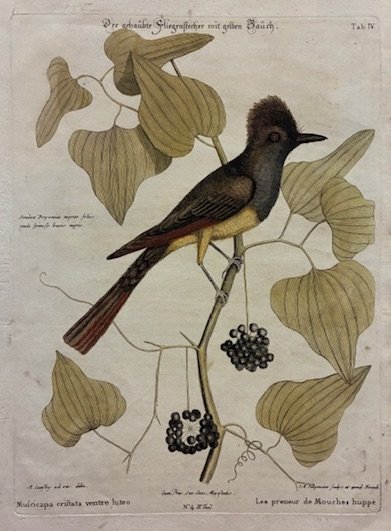 Incisione originale su rame (cm. 22x28,5 più ampi margini bianchi) tratta dalla ricercata opera ‘Sammlung verschneider auslandischer und seltener Vogel’. Coloritura d’epoca all’acquarello. Esemplare in ottimo stato di conservazione.