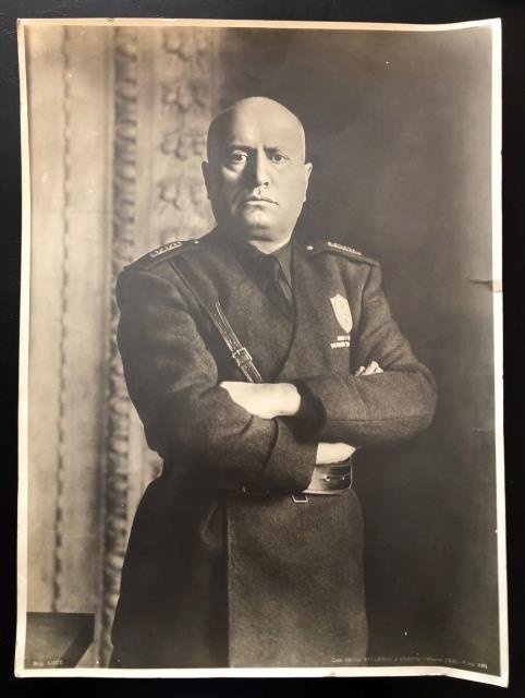 In basso a sn. "Neg. Luce" – in basso a ds. "Casa Editrice Ballerini e Fratini, Firenze (125) - Anno XIII; al retro, in basso a ds. il numero 21537. Fotografia all'albumina, b/n, cm 29 x 39 circa. Benito Mussolini, ripreso in primo piano e a figura quasi intera, posa in uniforme e in consueta posizione a braccia conserte. Una piega in basso a destra e alcune altre pieghe più limitate e marginali (facilmente rimodulabili) non disturbano se non lievemente questa bella fotografia ancora nitida e in buono stato di conservazione. .