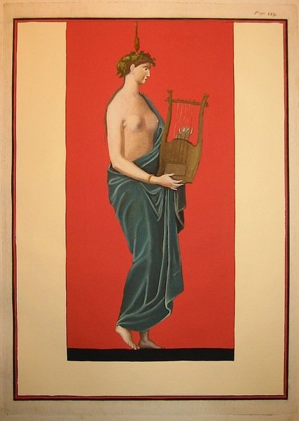 Incisione originale su rame (cm. 24,5x34,5 più ampi margini), tratta dall’opera ‘Le pitture antiche d’Ercolano e contorni.’ di Ottavio Antonio Baiardi. Bella coloritura a tempera e acquerello.