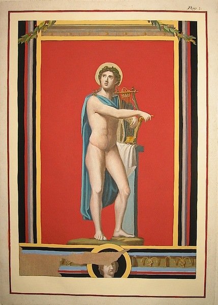 Incisione originale su rame (cm. 24,5x34 più ampi margini), tratta dall’opera ‘Le pitture antiche d’Ercolano e contorni.’ di Ottavio Antonio Baiardi. Bella coloritura a tempera e acquerello.