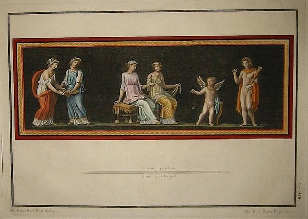 Incisione originale su rame (cm. 34,5x24,5 più ampi margini) da un disegno di Nicola Vanni, tratta dall’opera ‘Le pitture antiche d’Ercolano e contorni.’ di Ottavio Antonio Baiardi. Bella coloritura a tempera e acquerello.