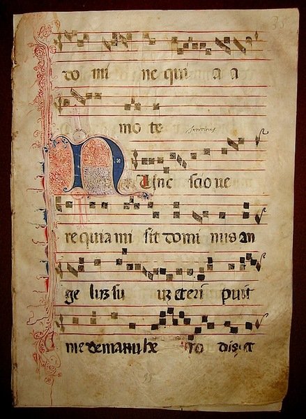 Manoscritto su pergamena (foglio di cm. 32x45) proveniente da Graduale. Inchiostro rosso e nero con due iniziali miniate (una al recto, l’altra al verso) in rosso e bleu.