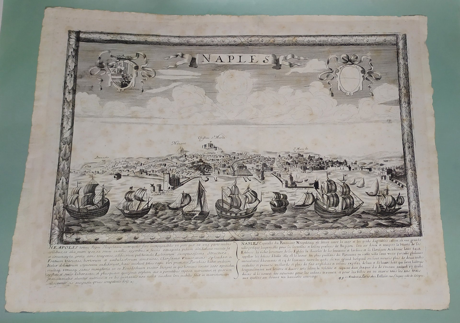 JOLLAIN François. Naples. Parigi, 1680 circa. Cm. 40x53. Incisione su rame, titolo entro cartiglio in alto al centro del foglio, ai lati stemmi, al di sotto della veduta, contenuta in cornice ornata, parte di testo in latino e francese, firmata in lastra in basso a destra. Pane Valerio, pag. 161.