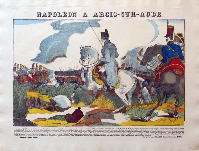 Epinal, Jean Charles Pellerin, seconda metà del XIX secolo (1877 circa). Incisione su legno in coloritura d'epoca, cm 48 x 63 circa (il foglio). La veduta è stata incisa dal Georgin e stampata dal Pellerin, il più importante editore di Epinal, cittadina del dipartimento dei Vosgi, nella regione della Lorena. Al margine inferiore la didascalia descrittiva dell'episodio: si raffigura un momento della battaglia di Arcis - sur Aube del 1814, vinta dall'esercito austriaco. Piega centrale editoriale, bella coloritura e ottima conservazione.