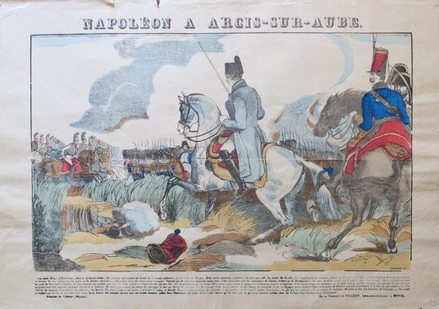 Epinal, Jean Charles Pellerin, 1850 – 1870 circa. Incisione su legno in coloritura d'epoca, cm 43 x 63 circa (il foglio). La veduta è stata incisa dal Georgin e stampata dal Pellerin, il più importante editore di Epinal, cittadina del dipartimento dei Vosgi, nella regione della Lorena. Al margine inferiore la didascalia descrittiva dell'episodio: si raffigura un momento della battaglia di Arcis - sur Aube del 1814, vinta dall'esercito austriaco. Piega centrale editoriale, minimi difetti marginali del foglio, peraltro in piacevole coloritura e buona conservazione.