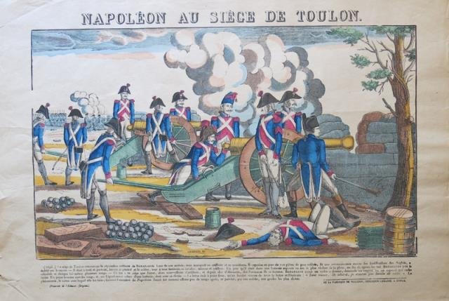 Epinal, Jean Charles Pellerin, 1850 - 1870 circa. Incisione su legno in coloritura d'epoca, cm 43 x 63 circa (il foglio). La veduta è stata incisa dal Georgin e stampata dal Pellerin, il più importante editore di Epinal, cittadina del dipartimento dei Vosgi, nella regione della Lorena. Al margine inferiore la didascalia descrittiva dell'episodio: Napoleone all'assedio di Tolone. Piega centrale editoriale, uno strappo riparato alla metà del lato sinistro e molto poco visibile, minimi difetti marginali del foglio, peraltro in piacevole coloritura e buona conservazione.