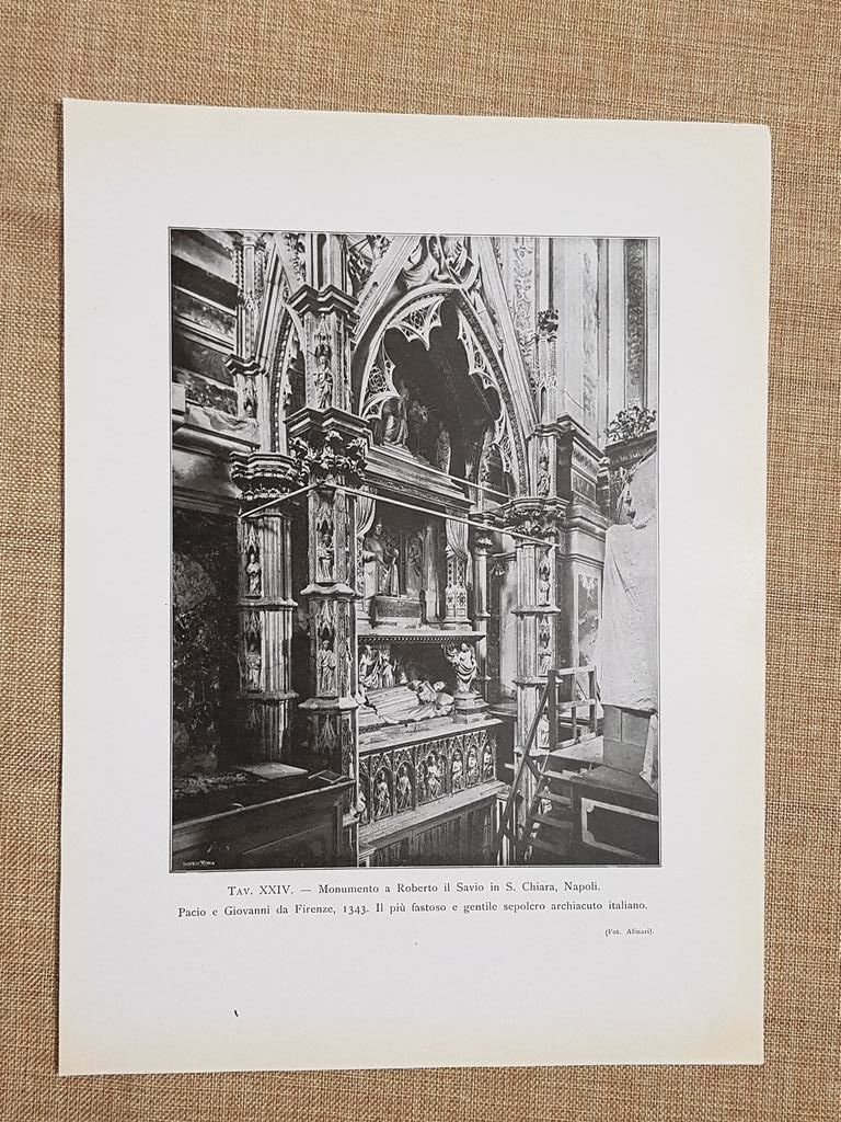 Napoli 1917 Monumento a Roberto Savio S. Chiara Pacio e Giovanni da Firenze 1343 Rara tavola estratta da pubblicazione del 1917 Stampata su carta non retroscritta A Napoli nel 1917 Il Monumento a Roberto il Savio in Santa Chiara Pacio e Giovanni da Firenze, 1343 Campania Dimensioni: Cm 22,00 x 30,00 Codice prodotto: 1911-075