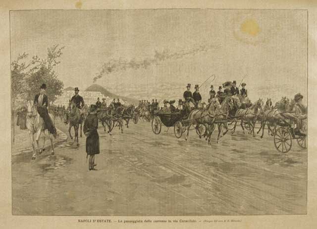Veduta di Via Caracciolo durante la passeggiata delle carrozze. Testo al verso