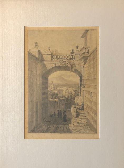 Disegno a matita colorata su cartoncino, seconda metà ‘800, cm 23,9 x 32,9 (il foglio). Scorcio in un vicolo in discesa sotto l’arco di una villa, numerose figure; sullo sfondo un paio di cupole e la città. Disegno di notevole qualità, molto ben eseguito. Buono stato.