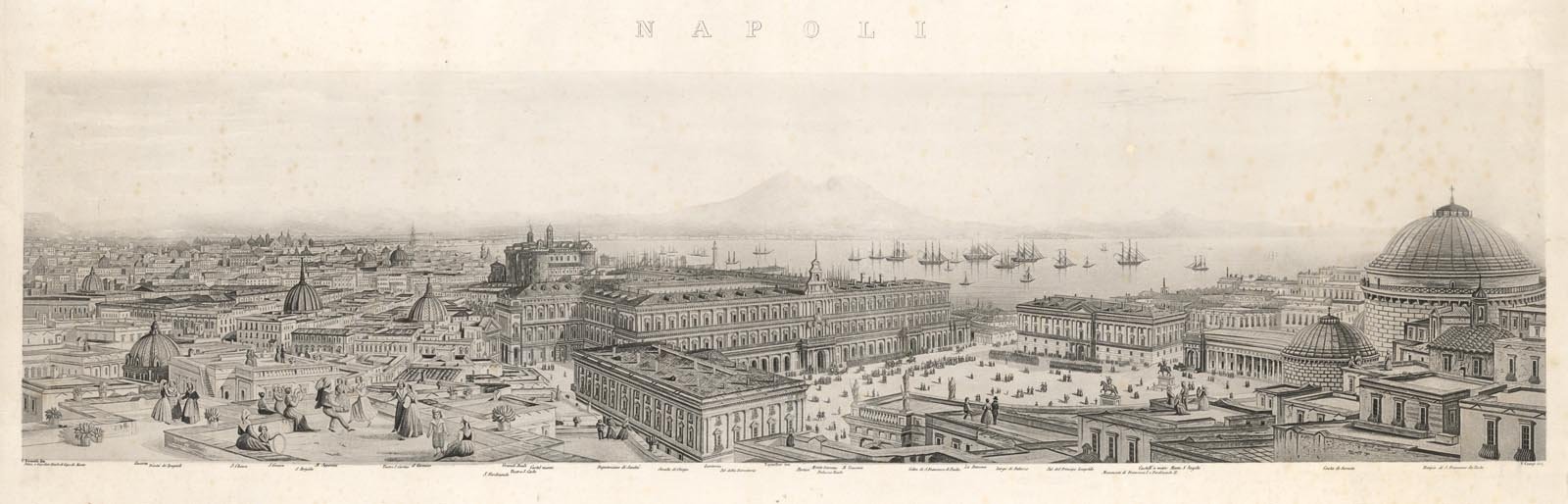 Sotto la stampa sono riportati trenta rimandi per un agevole lettura delle località presenti nella raffigurazione. In calce sulla destra "Milano dall’Editore ANTONIO VALLARDI Cont S. Margherita N. 1118". La veduta panoramica è animata sulla sinistra, da personaggi: un ragazzo e una ragazza danzano al ritmo della tarantella, mentre alcune donne osservano la scena. Il punto di presa molto arretrato permette una straordinaria apertura della composizione, la cui linea d’orizzonte è determinata dal profilo montuoso, con al centro il Vesuvio. Restauro sul margine destro+Rif.: Valerio – Pane pag. 398 n° 229