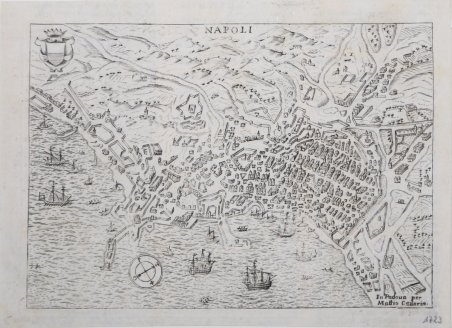Veduta della città, edita per la prima volta nel 1599 nel "Theatrum Urbium Italicarum", serie di 59 tavole con vedute e piante accompagnate da descrizione latina, eseguite da più incisori, poi ristampata, accresciuta, anche con il titolo italiano Teatro delle città d’Italia, per i tipi di Domenico Amadio.Alla morte di Pietro , l’attività proseguì con suo figlio Francesco, anch’egli tipografo, incisore e editore. Il "Teatro delle città d’Italia" venne più volte ristampato e implementato da Francesco nel corso del secolosuccessivo. Questo esemplare è tratto dall'opera ' Universus terrarum orbis scriptorum calamo delineatus . qui de Europae, Asiae, Africae, & Americae regnis, provinciis, populis, civitatibus. pubblicata a Padova nel 1713, presso Matteo Cadorin, da Raffaello Savonarola, sotto lo pseudonimo di Lasor a Varea (o Varela). L'opera era una sorta di enciclopedia che conteneva notizie sulle varie località del mondo disposte in ordine alfabetico, arricchita da mappe e vedute di tutto il mondo che appartengono a celebri raccolte cartografiche del passato – Bertelli, Valegio, Camocio, Bonifacio, Nelli, Magini e altri – del quale probabilmente l’editore Cadorin era in possesso delle matrici originali. Incisione su rame, ampi margini, in ottimo stato di conservazione. This example is taken from the work ' Universus terrarum orbis scriptorum calamo delineatus . qui de Europae, Asiae, Africae, & Americae regnis, provinciis, populis, civitatibus. ' published in Padua in 1713, at Matteo Cadorin, by Raffaello Savonarola, under the pseudonym of Lasor a Varea (or Varela). The work was a kind of encyclopedia containing news about the various localities of the world arranged in alphabetical order, enriched with maps and views of the whole world belonging to famous cartographic collections of the past-Bertelli, Valegio, Camocio, Bonifacio, Nelli, Magini, and others-of which the publisher Cadorin probably possessed the original plates. Copper engraving, in excellent condition. Cfr.