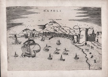 In alto al centro, sotto al bordo superiore, il titolo: NAPOLI. In basso a destra le iniziali F B e nell’angolo, in una targhetta, le iniziali L. P. Opera priva di orientazione e scala grafica. Acquaforte e bulino, stampata su carta vergata coeva, rifilata al rame e con margini aggiunti, in ottimo stato di conservazione, Veduta della città dal ponte della Maddalena. Si basa sul modello silografico introdotto da Guillaume Gueroult a Lione nel 1551, pubblicato poi nel Premier livre des figures et pourtraitz de villes edito da Balthazar Arnoullet l’anno seguente, che rappresenta la prima veduta della città presa dal ponte della Maddalena e che il Guerolt potrebbe aver disegnato dal vivo durante il suo viaggio in Italia. L’opera del Bertelli che replica fedelmente la veduta pubblicata l’anno precedente (1567) da Paolo Forlani, si distingue per la presenza di un nutrito gruppo di uccelli nel cielo, assenti invece nella veduta del Forlani. La stampa è firmata in lastra con i monogrammi che identificano Ferrando Bertelli, in qualità di editore, e Ludovico Pozzoserrato, quale incisore dell’opera. Oltre a trovarsi in alcune raccolte fattizie cinquecentesche di grande formato, è inserita nella raccolta Civitatum aliquot insigniorum et locorum, magis munitorum exacta delineatio: cum additione aliquot insularum principalium, edita da Ferrando Bertelli a Venezia nel 1568. “Altra opera di notevole interesse nell’ambito della cartografia urbana rinascimentale e il Civitatum aliquot insigniorum et locorum… di Ferdinando o Ferrando Bertelli. Bertelli nasce a Boarno di Salo, l’odierna Vobarno, intorno al 1520. Incisore, editore, calcografo e mercante di stampe attivo a Venezia all’insegna di S. Marco in Merzaria. Poco conosciamo della sua vita, di certo collaboro con Camocio e con Paolo Forlani per l’edizione e la vendita di incisioni, carte geografiche e piante di città. Nel filone dell’iconografia urbana, Ferrando si inserì nel periodo di iniziale fervore editoriale, che coinvolse molti degli editori veneziani. La sua opera più importante e appunto la raccolta dal frontespizio bilingue, italiano e latino, Civitatum aliquot insigniorum et locorum, magis munitorum exacta delineatio: cum additione aliquot insularum principalium. Disegni di alcune piu illustri citta, et fortezze del mondo, con aggionta di alcune Isole principali, con imprint Ferrando Bertelli formis M.D.LXVIII (1568). Si tratta di un’opera molto particolare, priva di indice, e quindi, anche in questo caso come già abbiamo visto per il “Primo Libro” di Forlani-Zenoi, ogni esemplare esaminato risulta diverso dall’altro. Questa peculiarità avvalora l’ipotesi che le raccolte urbane venissero assemblate secondo la richiesta del committente. La mancanza di indice, unitamente al fatto che il frontespizio venne in seguito utilizzato da Donato Bertelli (con il quale non si e potuto stabilire un legame di parentela) fa si che sotto lo stesso titolo possano talvolta ritrovarsi collezioni eterogenee, sia per soggetti che per numero di immagini. Altro elemento che caratterizza la raccolta di cartografia urbana di Bertelli e la presenza, sulla scia della tradizione rinascimentale veneziana, di numerose carte raffiguranti le isole, firmate dallo stesso Ferrando ma anche dal dalmata Natale Bonifacio (1538-1592). Per quanto riguarda le vedute e piante di città Bertelli si affida a molteplici incisori, alcuni dei quali rimangono noti solamente attraverso il monogramma riportato sulla lastra. Le opere sono monogrammate A.B., F.F., E.B. e L.P. Quest’ultimo e stato identificato con l’artista Lodovico Pozzoserrato o Lodovico Pozzo da Treviso (italianizzazione di Lodewijk Toeput, 1550-1605 circa), pittore e incisore fiammingo naturalizzato italiano, attivo in Veneto e in particolar modo a Treviso. Molte delle opere sono derivazioni (ovvero copie) di quelle pubblicate da Paolo Forlani nel “Primo Libro” del 1567. Altre lastre sono incise da Dom. In the upper center, below the upper border, the title: NAPLES. In the lower right corner the monogram F B and, in a small table in the corner, the initials L. P. No orientation and graphic scale. Etching and engraving, printed on contemporary laid paper, trimmed close to platemark, margins added, in excellent condition, ' View of the city from the Magdalene bridge. It is based on the silographic model introduced by Guillaume Gueroult in Lyon in 1551, then included in the Premier livre des figures et pourtraitz de villes published by Balthazar Arnoullet the following year, which represents the first view of the city taken from the Magdalene bridge and that Guerolt may have drawn from life during his journey in Italy. The Bertelli’ view, a close copy of the Paolo Forlani one, published the previous year (1567), is distinguished by the presence of a large group of birds in the sky,. The print is signed on the plate with the monograms FB and LP that identify respectively Ferrando Bertelli, as publisher, and the monogram Ludovico Pozzoserrato, as engraver. ' The view, in addition to being included in some sixteenth-century factual collections of large format, is included in the collection Civitatum aliquot insigniorum et locorum, magis munitorum exacta delineatio: cum additione aliquot insularum principalium, published by Ferrando Bertelli in Venice in 1568. ' “Altra opera di notevole interesse nell’ambito della cartografia urbana rinascimentale e il ' Civitatum aliquot insigniorum et locorum… ' di Ferdinando o Ferrando Bertelli. Bertelli nasce a Boarno di Salo, l’odierna Vobarno, intorno al 1520. Incisore, ' editore, calcografo e mercante di stampe attivo a Venezia ' all’insegna di S. Marco in Merzaria. ' Poco conosciamo della sua ' vita, di certo collaboro con Camocio e con Paolo Forlani per l’edizione e la vendita di incisioni, carte geografiche e piante ' di città. Nel filone dell’iconografia urbana, Ferrando si inserì nel periodo di iniziale fervore edi