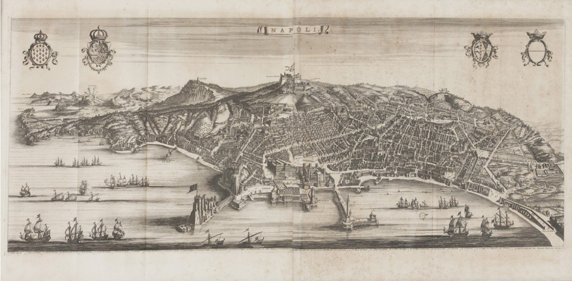 Napoli. Incisione all’acquaforte pubblicata ad Amsterdam nel 1724 dal rilievo di Bastiaen Stoopendaal edito alla fine del secolo decimosettimo. Sontuosa e classica pianta ad alzata della città. Un artistico efficace contrasto di chiaroscuro appaga l’esteta oltre che lo studioso: i monumenti, le vie, i fastosi palazzi, i celebrati castelli, i famosi quartieri spagnoli, le porte monumentali sono raffigurati con precisione e cura. Cm.42x100 oltre margini.