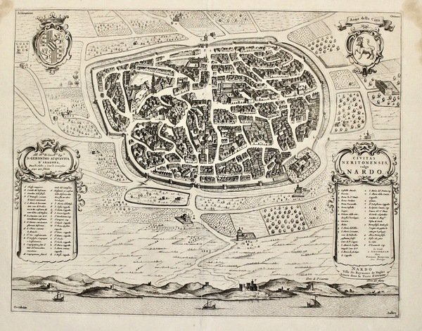 Incisione in rame, 414x525. Pianta prospettica della città di Nardò in Puglia. Mortier, editore attivo ad Amsterdam ad inizio secolo, ristampò il "Theatrum Civitatum…Italiae" di Blaeu del 1663 aggiungendovi un quarto volume, relativo a nord Italia e Toscana. Bell' esemplare con piega editoriale centrale e lieve ingiallimento generale della carta. Strappetti al margine superiore, alcune macchie ai margini esterni nella parte alta.