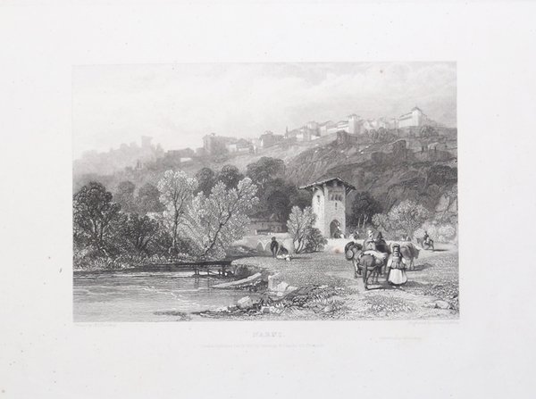 Veduta tratta da The Tourist in Switzerland and Italy. Illustrated from drawings by S. Prout, Esq… London: Robert Jennings, 1830 di Thomas Roscoe. Il Tourist in Switzerland and Italy è il primo di nove volumi conosciuti sotto il nome di The Landscape Annual”. I volumi successivi riguardano la sola Italia e poi Francia e Spagna. L'opera è illustrata da incisioni tratte da disegni del pittore inglese Samuel Prout di J. D. Harding ed altri; è stampata a Londra tra il 1830 ed il 1838. ' Incisione in rame, in ottimo stato di conservazione. View from The Tourist in Switzerland and Italy. Illustrated from drawings by S. Prout, Esq. London: Robert Jennings, 1830 by Thomas Roscoe. The Tourist in Switzerland and Italy is the first of nine volumes known as The Landscape Annual. Subsequent volumes cover Italy alone and then France and Spain. The work is illustrated with engravings from drawings by the English painter Samuel Prout, J. D. Harding and others; it was printed in London between 1830 and 1838. ' Copperplate, in excellent condition. Cfr.