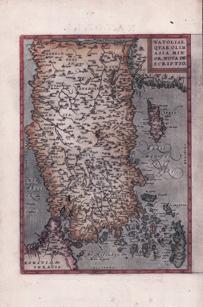 Carta geografica tratta dal ' Theatrum Orbis Terrarum, edizione latina del 1603. Il ' Theatrum Orbis Terrarum ' è considerato il primo vero “atlante” moderno. L’opera fu pubblicata in 7 lingue e 36 edizioni, per il quale – nel 1570 - Ortelius ottenne il ' privilegio, ovvero una sorta di diritto d'autore che impediva ad altri cartografi di pubblicare i propri lavori. Il ' Theatrum ' rappresentava il lavoro più avanzato del lavoro della descrizione cartografica. L’Ortelius vi raccolse il sapere geografico e cartografico del suo tempo, proponendo in 147 spettacolari tavole incise l’immagine più fedele del mondo allora conosciuto e, in alcune straordinarie “carte storiche”, regioni e itinerari tratti dalla letteratura, dalla mitologia, dalla tradizione. Ortelius fu anche il primo a citare le fonti, menzionando i nomi dei cartografi nel “catalogus auctorum”. Dal 1598 al 1612 le edizioni postume del ' Theatrum ' furono realizzate dal suo collaboratore Johannes Baptiste Vrients. Incisione in rame, bellissima coloritura, in ottimo stato di conservazione. Map of Turkey and Cyprus by A. Ortelius. ' Taken from the ' Theatrum Orbis Terrarum, ' latin edition of 1603. Map taken from the ' Theatrum Orbis Terrarum, which is considered the first true modern "Atlas". The work was published in 7 languages and 36 editions, for which - in 1570 - Ortelius obtained the privilege, a kind of copyright that prevented other cartographers from publishing his works. The ' Theatrum ' represented the most advanced work of cartographic description. Ortelius collected in it the geographical and cartographic knowledge of his time, proposing in 147 spectacular engraved plates the most faithful image of the world then known and, in some extraordinary "historical maps", regions and routes taken from literature, mythology, tradition. Ortelius was also the first to cite sources, mentioning the names of cartographers in the "catalogus auctorum". From 1598 to 1612 the posthumous editions of the ' Theatrum ' were made by his collaborator Johannes Baptiste Vrients. Etching with fine hand colour, in good condition. Cfr.