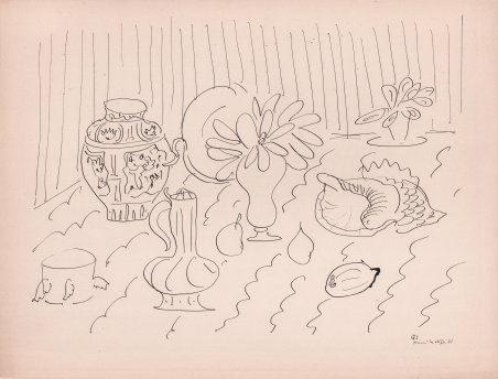 Colotipia su carta Arches, firmata e datata in basso a destra G 1 ' Henri Matisse 41. Una bella impressione, condizioni eccellenti. Henry Matisse nasce nel 1869 a Cateu Cambrésis. Inizia a dipingere durante la convalescenza per una malattia, scoprendo una grande passione per l'arte. Lascia così la facoltà di giurisprudenza per iscriversi nel 1891 all’Accademia Julian di Parigi. Viene ammesso nel 1992 all'?cole des Beaux-Arts, presso lo studio di Gustave Moreau dove si esercita nella copia di opere esposte al Louvre e dal vero. Rifiuta presto il conformismo delle accademie ed inizia una ricerca artistica personale frequentando lo studio di Carrière e studiando scultura sotto la guida di Barye e Rodin. Espone regolarmente al Salon des Indipendace e, a partire dal 1903 al Salon d’Automne, mentra la prima mostra personale risale al 1904 presso la galleria Vollard. Nel 1905 i lavori di Matisse e quelle dei suoi compagni esposte al Salon d’Automne vengono definite da un critico francese “fauves”, ovvero belve, per descrivere opere dai colori squillanti e dalle forme piatte. Grazie alla frequentazione del salotto di Gertrude Stein conosce Picasso e Alfred Stieglitz che porta Matisse ad esporre a New York. Dopo il 1907 si assiste ad una progressiva ricerca della semplificazione formale, mentre dopo il 1913 è evidente l'influenza dei suoi viaggi in Marocco. Nel 1917 Matisse si trasferisce a Nizza ed inizia a viaggiare con intensità tra gli Stati Uniti, l'Europa e la Polinesia. Il più importante progetto degli ultimi sarà la costruzione della Cappella dei Domenicani a Vence realizzata dal 1948 al 1951. Matisse muore a Nizza il 3 novembre del 1954. Colotype on arches vellum paper, signed and dated at lower right G ' 1 Henri Matisse 41. A fine impression, excellent codition. Henri Émile Benoît Matisse (31 December 1869 ' – ' 3 November 1954) was a French artist, known for both his use of colour and his fluid and original draughtsmanship. He was a draughtsman, printmaker, and sculptor, but is known primarily as a painter. Matisse is commonly regarded, along with Pablo Picasso, as one of the artists who best helped to define the revolutionary developments in the visual arts throughout the opening decades of the twentieth century, responsible for significant developments in painting and sculpture. The intense colorism of the works he painted between 1900 and 1905 brought him notoriety as one of the Fauves (wild beasts). Many of his finest works were created in the decade or so after 1906, when he developed a rigorous style that emphasized flattened forms and decorative pattern. In 1917, he relocated to a suburb of Nice on the French Riviera, and the more relaxed style of his work during the 1920s gained him critical acclaim as an upholder of the classical tradition in French painting. After 1930, he adopted a bolder simplification of form. When ill health in his final years prevented him from painting, he created an important body of work in the medium of cut paper collage. His mastery of the expressive language of colour and drawing, displayed in a body of work spanning over a half-century, won him recognition as a leading figure in modern art. Cfr.