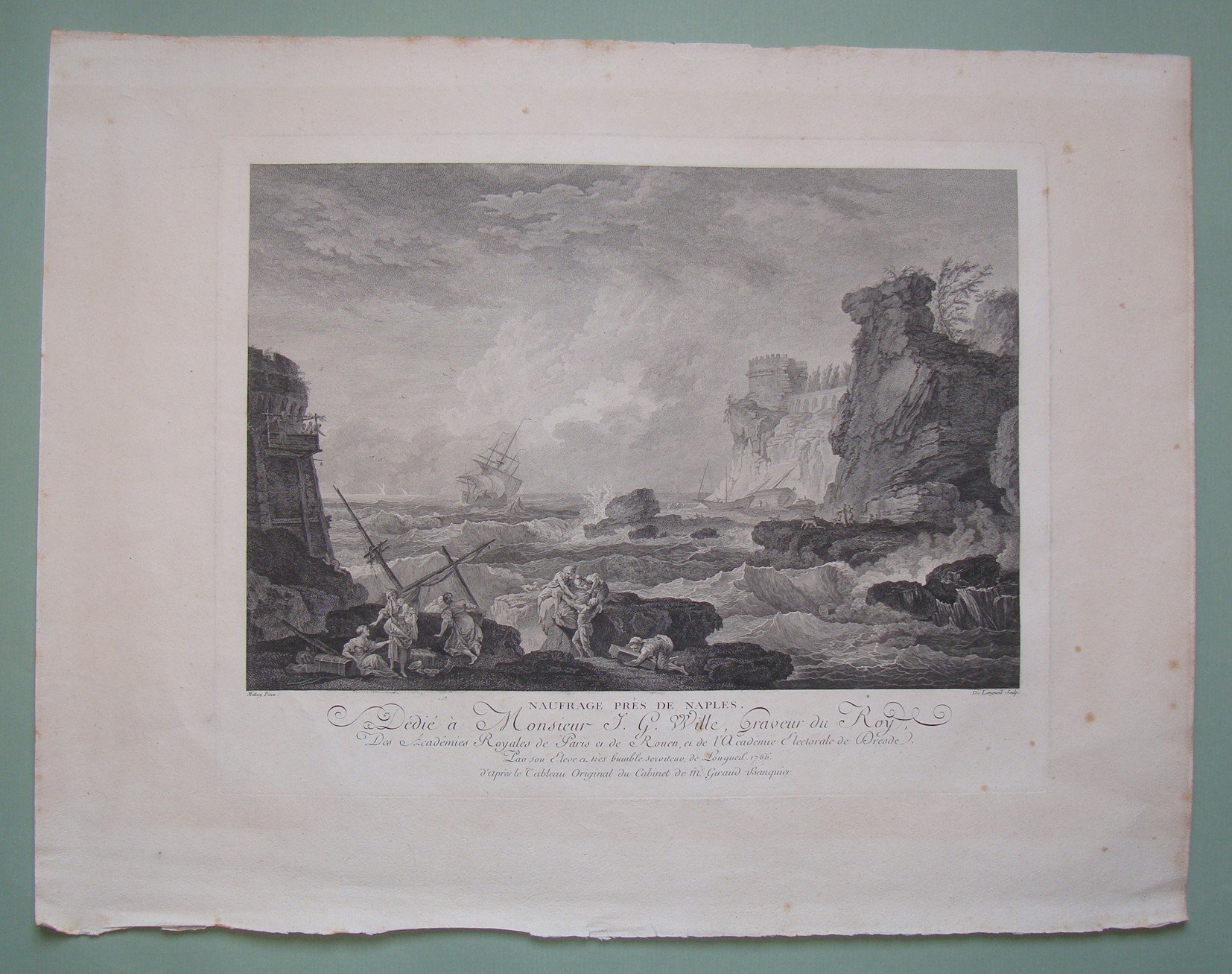 METTAY- DE LONGUEIL. Naufrage pres de Naples. Parigi, 1766. Cm.34x43 oltre margini con barbe. Incisione in rame di de Longueil da un dipinto di Mettay.