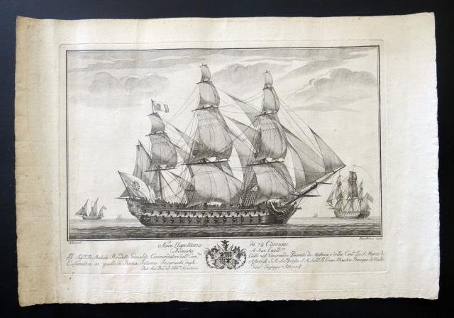 Giacomo Aliprandi, Livorno, 1790 circa. Acquaforte, b/n, cm 26,5 x 37 circa (alla battuta) più margini, al margine inferiore "Dedicata a Sua Eccell.za Il Sig.r I. D. Michele Benedetto Grimaldi.", in bs. a sn. "Allezard", in bs. a ds. "Fambrini inci.". Ferdinando Fambrini (1764 - 1780) attivo a Lucca e celebre per aver illustrato la prima edizione italiana dell' "Encyclopédie" di Denis Diderot e Jean Baptiste le Rond d'Alembert (curata da Ottaviano Diodati per la Stamperia Lucchese tra il 1758 e il 1776). Una leggera patina della carta, lievi ondulazioni, ben impressa e in margini. .