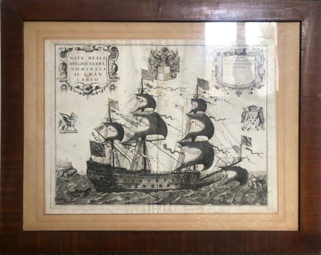 Venezia, 1690 circa. Incisione in rama all’acquaforte, cm 47 x 60,5 circa (alla battuta della lastra) più margini. Celebre raffigurazione della nave da guerra della marina reale inglese, ripresa a grande misura e solcante i mari. Il titolo è ospitato da un grande e semplice cartiglio con volute (reso particolare dalla presenza di due granchi appesi) sulla sinistra, sulla destra un altro cartiglio (reso particolare dalla presenza di un piccolo scorpioncino appeso) reca la seconda parte del titolo ma rimane bianco nella parte sottostante (quasi l’esemplare fosse un “ante litteram”, ossia una tiratura non ancora del tutto completata dal punto di vista delle informazioni editoriali per la stampa), due stemmi araldici e un grifone raffigurato sul margine sinistro. L' “Atlante Veneto” è un atlante universale, edito dal 1690 al 1701, dal geografo francescano conventuale Vincenzo Maria Coronelli. Il proposito che lo animò fu quello di costituire la continuazione dell' “Atlas Major” di Joan Blaeu. Si tratta di un’ opera monumentale pubblicata in tredici volumi che forniva una messe di informazioni dettagliate su cartografi e geografi, antichi e moderni, insieme ad altrettanto dettagliati dati astronomici e storici. Le carte geografiche furono sempre incise e stampate su carta di qualità e le più importanti occupavano due pagine, permettendo un maggior dettaglio. La prima parte comprende un’introduzione alla geografia e incisioni di mappamondi, rose dei venti e sistemi cosmografici ripercorsi storicamente, da Tolomeo a Copernico, fino a Cartesio. La seconda parte tratta della Terra e contiene un mappamondo tolemaico e uno moderno, realizzati come due emisferi separati, e prosegue con le carte in due fogli di Europa, Asia, Africa, America del Sud e America del Nord, terminando con le carte delle calotte polari. La terza parte si occupa di idrografia, oceani, fiumi e laghi e qui si trovano carte dell’Oceano Pacifico e dell’Oceano Atlantico, del Bosforo, del Golfo di Venezia, e di fiumi come il Niger, il Rio delle Amazzoni, il Reno, il Danubio e il Volga. L'ultima parte descrive le navi che esplorarono questi corsi d'acqua e da questa quarta ed ultima parte è tratta questa bella incisione. Foxing e alcune lievi ondulazioni della carta, ben impressa e in margini, nell’insieme esemplare in discreto stato di conservazione (il prezzo si riferisce alla sola stampa senza cornice; se interessati anche alla cornice si prega di contattarci direttamente per accordo di spesa e spedizione). .