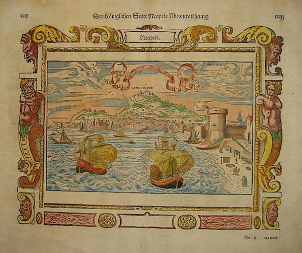 Xilografia originale (cm. 33x27 più margini bianchi) tratta da un’edizione in lingua tedesca della celebre ‘Cosmographia Universalis’. Bella coloritura antica all’acquarello. Ottimo esemplare.