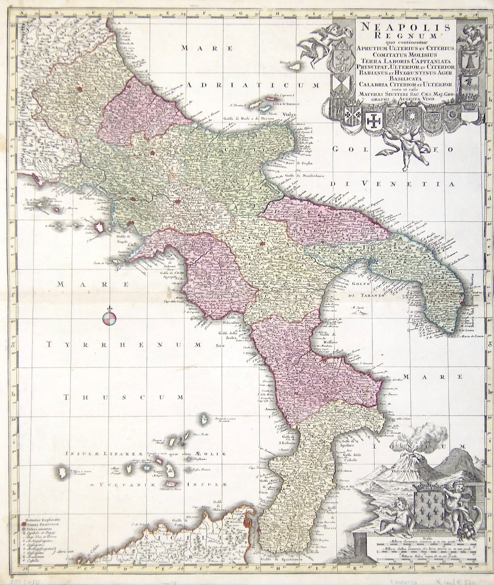Incisione in rame, colorata d'epoca, mm 590x505. Ottimo esemplare. Seutter, dopo un apprendistato presso Homann a Norimberga, trasferitosi ad Augsburg verso il 1710, aprì la propria attività superando il maestro sotto il profilo della bellezza: le sue carte hanno sempre colori brillanti e cartigli elaborati.