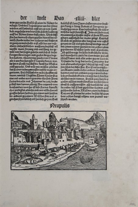 Veduta fantastica della città posta nella parte inferiore del foglio che contiene anche il teste descrittivo, tratto dal Liber cronicarum cum figuris et umaginibus ab initio mudi usus mit temporis rarissima edizione "tascabile" della celebre cronaca del mondo, edita ad Ausburg presso Johann Schonsperger, nel 1496. Prima edizione in tedesco dello Schonsperger. Egli abbrevia sia il testo sia il formato dello Schedel per produrre un edizione che fosse più maneggevole a commerciabile di quella di A. Koberger. Silografia, posta nella parte inferiore di un foglio di testo, in ottimo stato di conservazione. Rara. An imaginary view of the city, printed on the lower part of the sheet with the descriptive text, taken from Liber cronicarum cum figuris et umaginibus ab initio mudi usus mit temporis, a very rare "pocket" edition printed in Ausburg by Johann Schonsperger, in 1496. First German edition realized by Schonsperger. He cut both text and the size realized by Schedel to relize an edition that was to be more handy and saleable. Woodcut, printed in the central part of a double text sheet, minor repair on central fold, otherwise in good condition. Rare. Cfr.