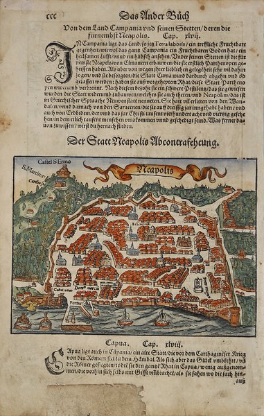 Tavola tratta dalla Cosmographiae Universalis, edizione in tedesco, Basilea, seconda metà del XVI secolo.La Cosmographiae Universalis di Sebastian Münster (1488-1552), stampata per la prima volta Basilea nel 1544 dallâeditore Heinrich Petri, venne più volte aggiornata e aumentata di nuove carte geografiche e rappresentazioni urbane nelle sue numerose edizioni che arrivano allâinizio del secolo successivo. Münster aveva lavorato a raccogliere informazioni al fine di ottenere un'opera che non deludesse le aspettative e, dopo un'ulteriore pubblicazione in tedesco abbellita da 910 stampe su legno, giunse nel 1550 all'edizione definitiva in latino, illustrata da 970 silografie. Vi furono poi numerose edizioni in diverse lingue, fra cui latino, francese, italiano, inglese e ceco. Dopo la sua morte di Münster (1552), Heinrich Petri prima, e il figlio Sebastian poi, continuarono la pubblicazione dellâopera. La Cosmographia universalis fu uno dei libri più popolari e di successo del XVI secolo, e vide ben 24 edizioni in 100 anni: l'ultima edizione tedesca venne pubblicata nel 1628, molto tempo dopo la morte dell'autore. La Cosmographia conteneva non solo le ultime mappe e vedute di tutte le città più famose, ma anche una serie di notizie enciclopediche di dettagli relative al mondo conosciuto, e sconosciuto. Il particolare successo anche commerciale di quest'opera fu dovuto in parte alle belle incisioni (tra i cui autori si possono citate Hans Holbein il Giovane, Urs Graf, Hans Rudolph Manuel Deutsch, David Kandel). Silografia, bella coloritura a mano, in buone condizioni.