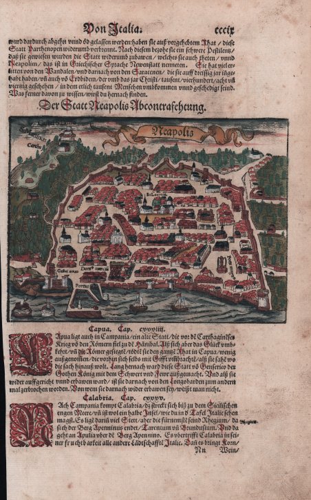 Tavola tratta dalla ' Cosmographiae Universalis, edizione in tedesco, Basilea, seconda metà del XVI secolo.La ' Cosmographiae Universalis ' di Sebastian Münster (1488-1552), stampata per la prima volta Basilea nel 1544 dall’editore Heinrich Petri, venne più volte aggiornata e aumentata di nuove carte geografiche e rappresentazioni urbane nelle sue numerose edizioni che arrivano all’inizio del secolo successivo. Münster aveva lavorato a raccogliere informazioni al fine di ottenere un'opera che non deludesse le aspettative e, dopo un'ulteriore pubblicazione in tedesco abbellita da 910 stampe su legno, giunse nel 1550 all'edizione definitiva in latino, illustrata da 970 silografie. Vi furono poi numerose edizioni in diverse lingue, fra cui latino, francese, italiano, inglese e ceco. Dopo la sua morte di Münster (1552), Heinrich Petri prima, e il figlio Sebastian poi, continuarono la pubblicazione dell’opera. La ' Cosmographia universalis ' fu uno dei libri più popolari e di successo del XVI secolo, e vide ben 24 edizioni in 100 anni: l'ultima edizione tedesca venne pubblicata nel 1628, molto tempo dopo la morte dell'autore. La ' Cosmographia ' conteneva non solo le ultime mappe e vedute di tutte le città più famose, ma anche una serie di notizie enciclopediche di dettagli relative al mondo conosciuto, e sconosciuto. Il particolare successo anche commerciale di quest'opera fu dovuto in parte alle belle incisioni (tra i cui autori si possono citate Hans Holbein il Giovane, Urs Graf, Hans Rudolph Manuel Deutsch, David Kandel). Silografia, bella coloritura a mano, in buone condizioni. Plate taken from the ' Cosmographiae Universalis, German edition, Basel, second half of the 16th Century. The ' Cosmographiae Universalis ' of Sebastian Münster (1488-1552), printed for the first time in Basel in 1544 by the publisher Heinrich Petri, was updated several times and increased with new maps and urban representations in its many editions until the beginning of the next century. Münster had worked to collect information in order to obtain a work that did not disappoint expectations and, after a further publication in German embellished with 910 woodblock prints, arrived in 1550 to the final edition in Latin, illustrated by 970 woodcuts. There were then numerous editions in different languages, including Latin, French, Italian, English and Czech. After his death in Münster (1552), Heinrich Petri first, and then his son Sebastian, continued the publication of the work. The ' Cosmographia universalis ' was one of the most popular and successful books of the 16th century, and saw as many as 24 editions in 100 years: the last German edition was published in 1628, long after the author's death. The ' Cosmographia ' contained not only the latest maps and views of all the most famous cities, but also a series of encyclopedic details related to the known, and unknown, world. The particular commercial success of this work was due in part to the beautiful engravings (among whose authors can be mentioned Hans Holbein the Younger, Urs Graf, Hans Rudolph Manuel Deutsch, David Kandel). Woodcut, beautiful hand-coloring, in good condition. Cfr.