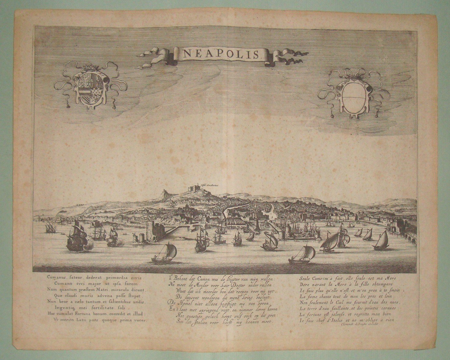 DE JONGHE Clement. Neapolis. Amsterdam,1670 circa. Cm.38x50. Incisione su rame, titolo entro cartiglio in alto al centro, ai lati stemmi nobiliari, al di sotto della veduta testo in latino, tedesco e francese, firmata in lastra in basso a destra. Pane Valerio, pag. 155.