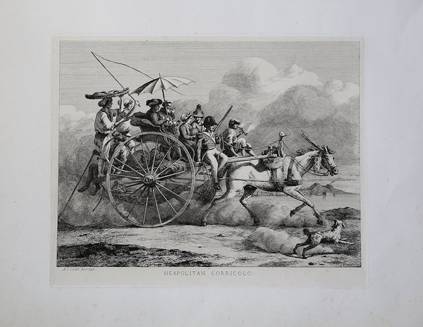 Scena di costume raffigurante il classico carretto napoletano; sullo sfondo la città e il Vesuvio. ' Dipinta dal vero ed incisa da Arthur John Strutt. Acquaforte, 1845 circa, firmata e datata in lastra in basso al centro. Figlio del pittore paesaggista Jacob George Strutt (1790-1864), del quale fu allievo, girovagò attraverso la Francia e la Svizzera in compagnia del padre, prima di giungere entrambi in Italia nel 1831, per stabilirsi a Roma. ' Rimase per il resto della sua vita in Italia, interessandosi soprattutto agli aspetti "pittoreschi", in particolare a quelli della Campagna romana, rivolgendo la sua attenzione, in modo specifico, ai paesaggi e ai costumi degli abitanti. Nel 1841 intraprese un viaggio a piedi verso il sud dell'Italia (allora Regno delle Due Sicilie, in compagnia dell'amico William Jackson, partendo da Porta San Giovanni (Roma) il 30 aprile e giungendo a Palermo il 15 dicembre, dopo aver attraversato la Campania e la Calabria. Le sue osservazioni furono raccolte in un libro, ' A pedestrian tour in Calabria & Sicily ' (Un viaggio a piedi in Calabria e in Sicilia) che ebbe un notevole successo, soprattutto nei paesi anglosassoni, ed è considerato ancor oggi un documento molto importante per comprendere la società del Regno delle Due Sicilie nel periodo pre-unitario. Magnifica prova, impressa su carta coeva, ampi margini, in perfetto stato di conservazione. Costume scene depicting the classic Neapolitan cart; in the background the city and Vesuvius. ' Painted from life and engraved by Arthur John Strutt. Etching, 1845 circa, signed and dated at the bottom. ' Arthur John Strutt (1819, in Chelmsford – 1888, in Rome), was an English painter, engraver, writer, traveller and archaeologist. He was the son of the landscape painter Jacob George Strutt (1790–1864) and the writer and traveller Elizabeth Strutt. In 1841 he travelled on foot through central and southern Italy and in Sicily. He and his friend, the poet William Jackson, otherwise unknown, started from the Porta San Giovanni of Rome on 30 April 1841, reaching Palermo on 15 December, and arriving back at Rome in July of the following year. An account of this journey is given in his A Pedestrian Tour in Calabria & Sicily published in London, in 1842. A fine impression, on contemporary paper, large margins, very good condition. Cfr.