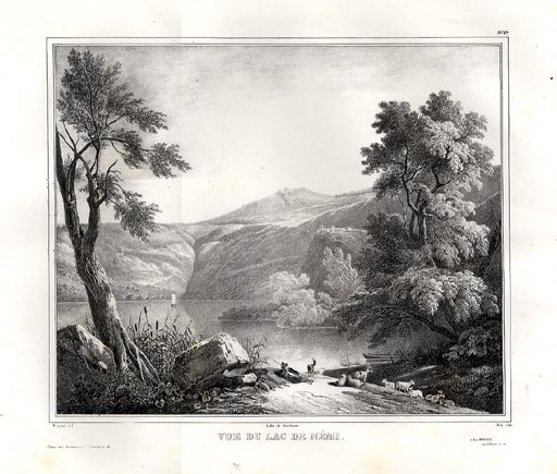 NEMI - "Vue du Lac de Nèmi" Coignet del. -Joly lith. Bellissimo e ampio paesaggio con il lago, alberi e un pastore con armenti in primo piano.