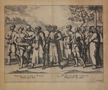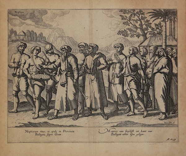 Scena di costume tratta dal celebre Itinerario, voyage ofte schipvaert van J.H. van Linschoten naar Oost ofte Portugaels Indien. L’opera fu pubblicata nel 1596, al ritorno in Olanda dopo anni spesi nelle Indie, in particolare nella colonia portoghese di Goa, dove Linschoten fu al servizio dell’Arcivescovo del Portogallo tra il 1583 ed il 1589. Le carte di Linschoten, basate su accurati portolani portoghesi del XVI secolo, forniscono le rotte più semplici e vantaggiose per il raggiungimento delle Indie. Incisione in rame, in ottimo stato di conservazione. Costumes taken from the famous Itinerario, voyage ofte schipvaert van J.H. van Linschoten naar Oost ofte Portugaels Indien. This plate appeared in Linschoten's book in 1596, once he came back from the Indies. The engraver for this map was Baptista van Doetechum. Cfr.