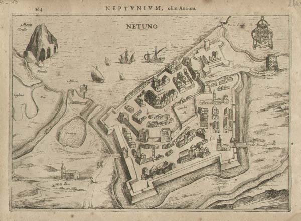 NETTUNO - "Neptunium, olim Antium. Netuno." Bella veduta a volo d'uccello della città , dintorni, porto con barche. In alto titoli e stemma.
