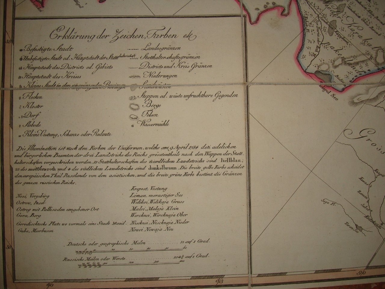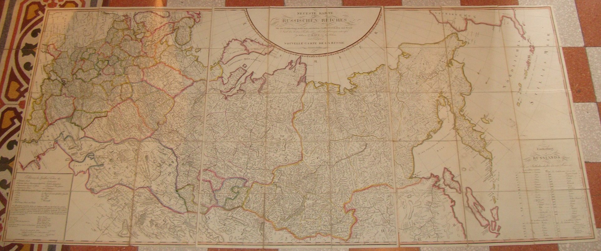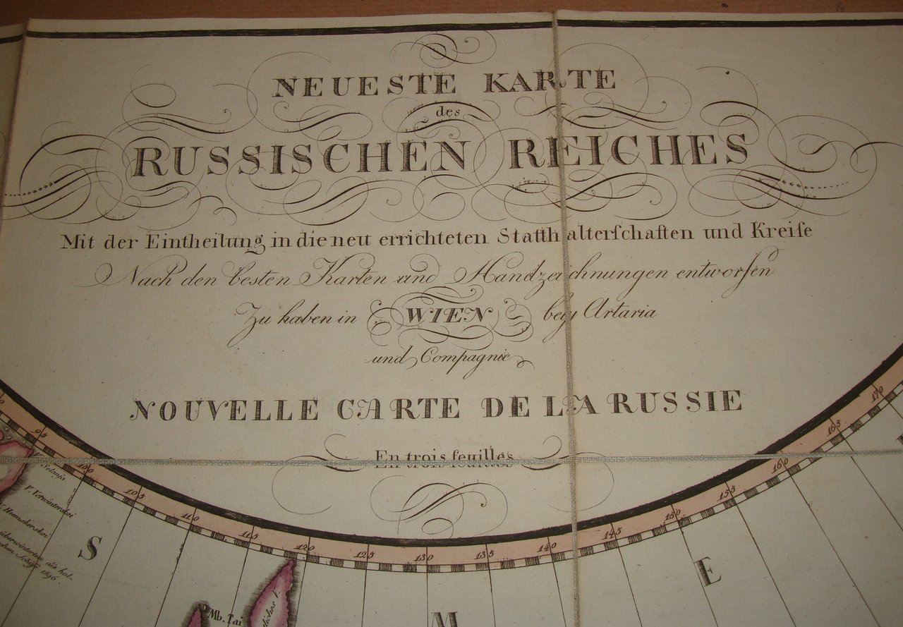 ARTARIA. Neuste karte des Russischen Reiches. Mit der Eintheilung in die neu errichteten Statth alterschaften und Kreise. Zu haben in Wien bey Artaria und Compagnie. Nouvelle Carte de la Russie en trois feuilles. Wien, 1807 ca. Cm. 80x1,75 on three sheets. Large engraved map dissected and mounted on linen, hand-coloured in outline. Titles in german and french. Half calf slipcase.